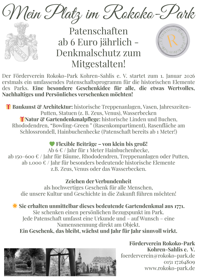 Der Erlös aller Aktionen geht zu 100% in den Förderverein und damit in die Rekonstruktion des Rokoko-Parks. Wir freuen uns auf alle bekannten und neuen Gesichter!