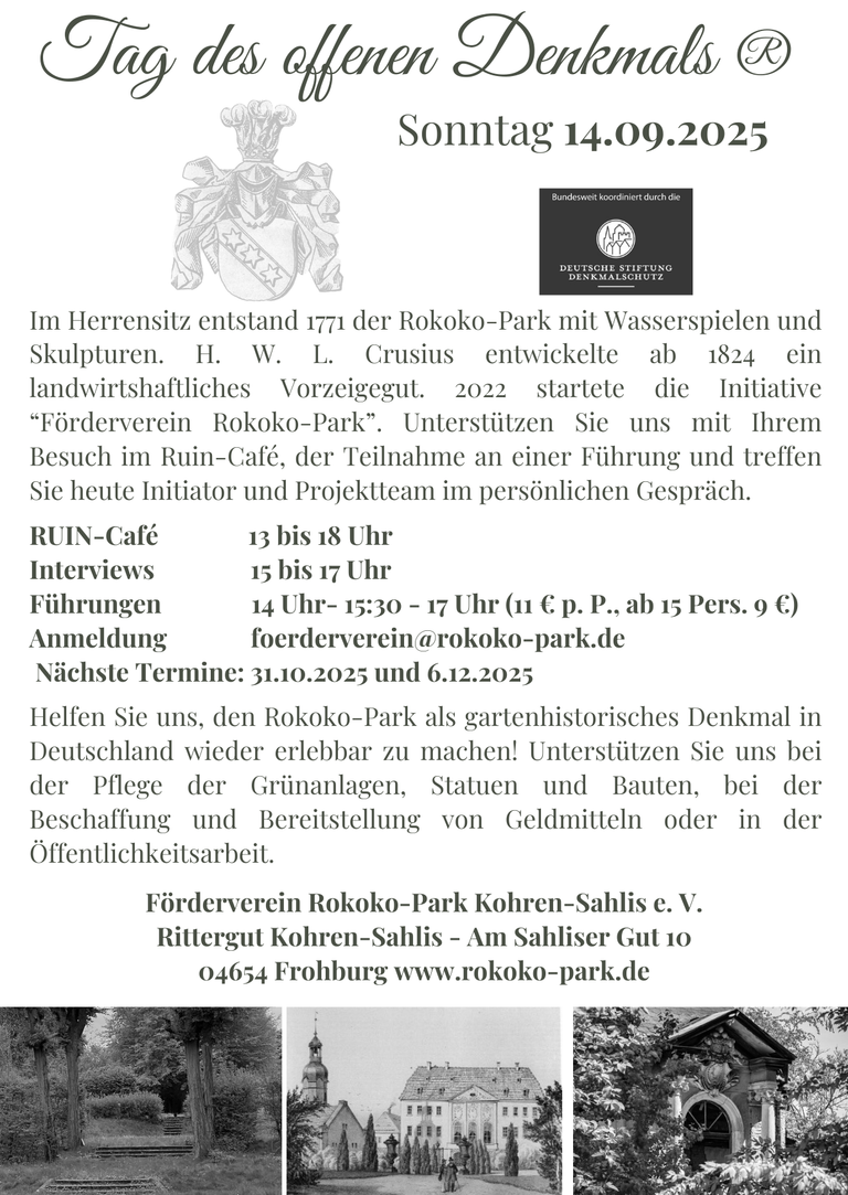 Besuchen Sie uns gern mehrmals! Unser Verein steckt noch in den Kinderschuhen, das Angebot wird stetig erweitert. Lassen Sie sich immer wieder neu vom Zauber des Rokoko-Parks in den Bann ziehen!